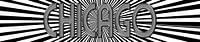 Schwarz weiße Grafik des Städtenamens "CHICAGO" vor einem Strahlenbündel