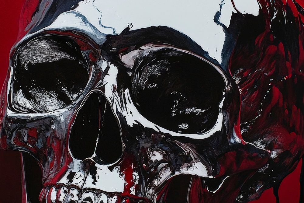 Glänzende Oberflächen und blutrote Akzente schaffen eine intensive, fast hypnotische Atmosphäre. Der Kontrast zwischen dem reflektierenden Schädel und dem tiefen Rot verleiht dem Raum eine düstere Eleganz. Ideal für ein modernes Wohnzimmer oder ein kreatives Büro, verführt dieses Kunstwerk zu tiefgründigen Gesprächen und regt die…