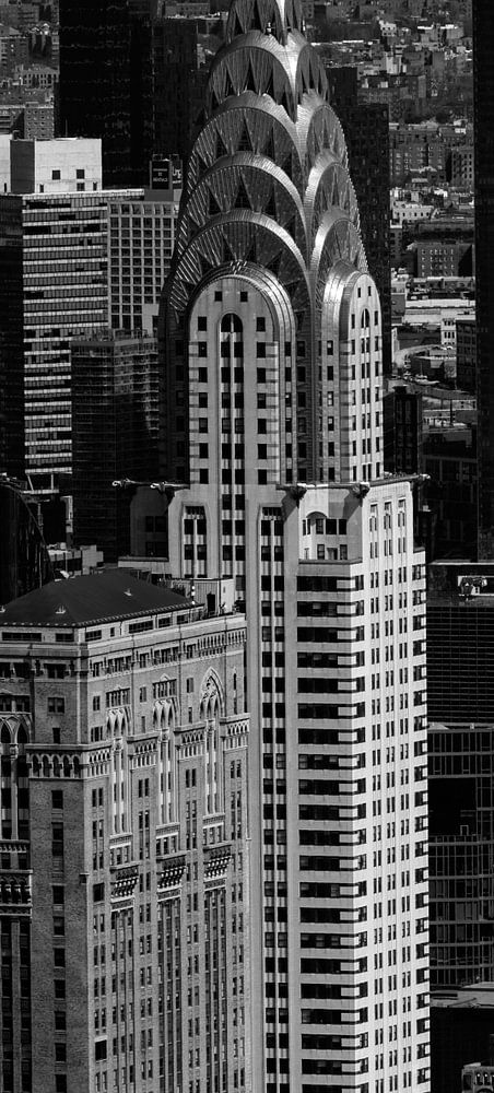 Das Art-Deco-Gebäude "Chrysler Building" in schwarz-weiß an einem sonnigen Tag.