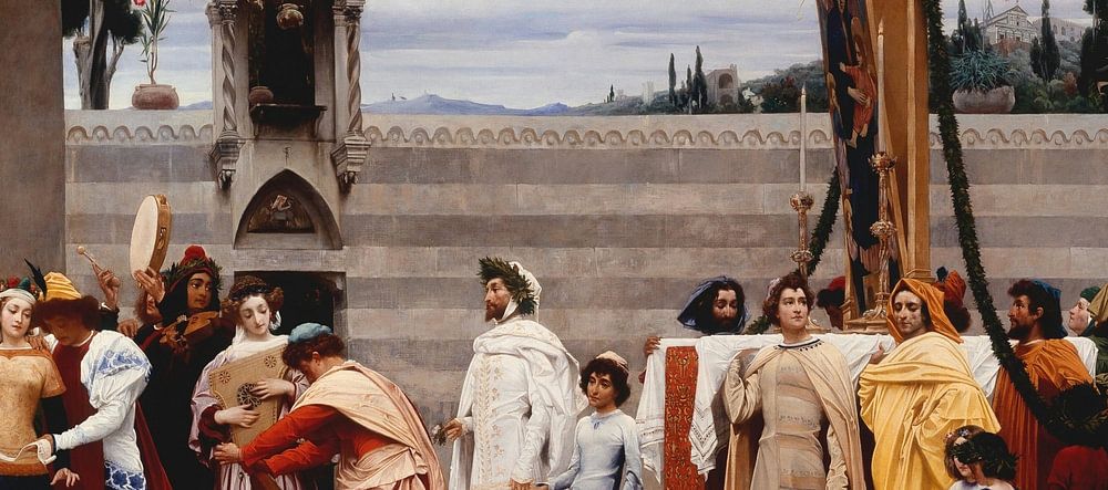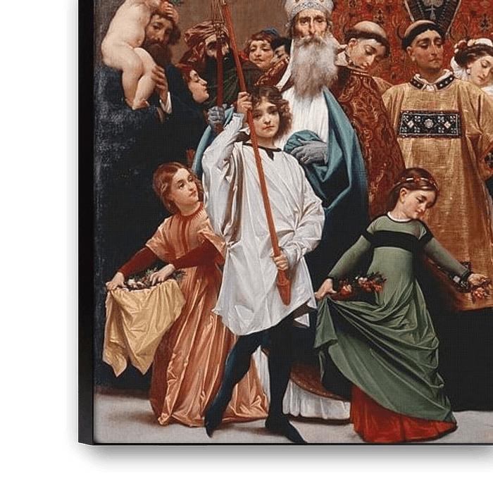 Cimabue's Madonna Carried in Procession, Frederic Leighton (1855) Eine farbenprächtige Prozession von Figuren begleitet das Altarbild der Madonna Rucellai (Uffizien, Florenz) durch die Straßen von Florenz. Die Szene basiert auf einer Erzählung aus den "Lebensläufen der Künstler" von Giorgio Vasari, der schrieb, dass "dieses Werk bei den Menschen jener Zeit so viel Bewunderung hervorrief - sie hatten noch nie etwas Besseres gesehen -, dass es in einer feierlichen Prozession unter Trompetenklängen und anderen festlichen Demonstrationen vom Haus des Cimabue zur Kirche getragen wurde".