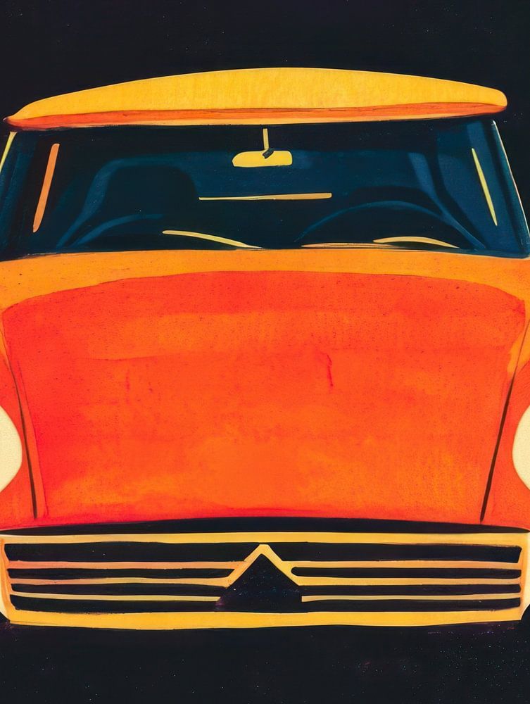 Dieses Kunstwerk fängt die zeitlose Eleganz und das avantgardistische Flair der kultigen Citroën DS in einer kühnen und modernen Komposition ein. Der auffällige orange-gelbe Farbton des Fahrzeugs bildet einen schönen Kontrast zum tiefschwarzen Hintergrund, während die abstrakten rosa Akzente eine verspielte und künstlerische Note hinzufügen. Die symmetrische Frontansicht des Wagens unterstreicht sein futuristisches und stromlinienförmiges Design, eine Hommage an die französische Design-Meisterschaft. Dieses Kunstwerk ist perfekt für Liebhaber von Oldtimern, Retro-Stil und moderner Kunst mit einem grafischen Touch.