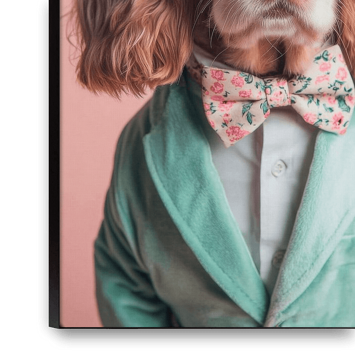 Ein eleganter Clumber Spaniel strahlt in seiner schimmernden, lockigen Fellpracht. Mit stylischen Sonnenbrillen und einer floralen Fliege verkörpert er charmante Nonchalance. Sein mintgrüner Anzug verleiht ihm eine exklusive Note, während die sanften, braunen Augen vielversprechend in die Kamera blicken. Hier trifft Hundecharme auf…