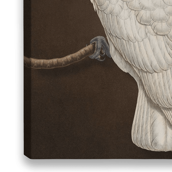 Vintage-Bild eines schönen, weißen Kakadus auf einem Ast. Auf dunkelbraunem Hintergrund. Da ich einen Schatten in das Kunstwerk eingefügt habe, entsteht ein 3D-Effekt.