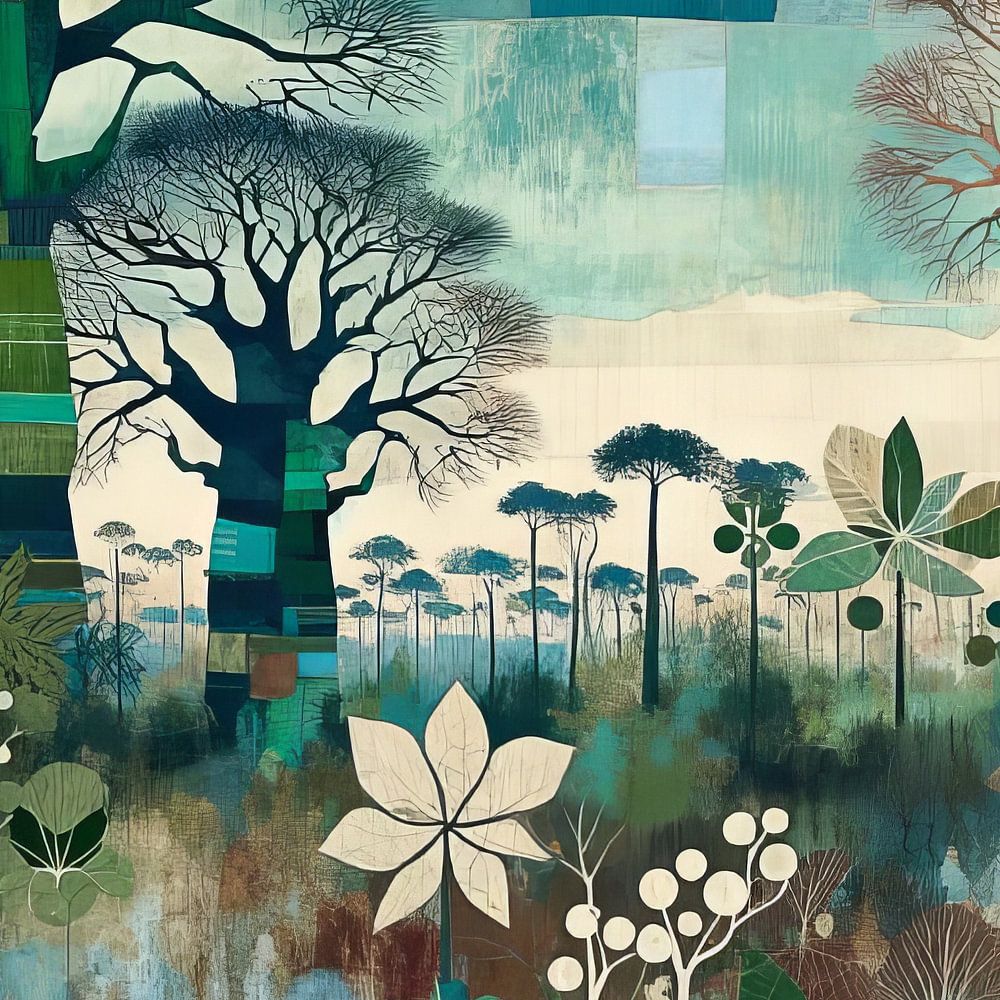 Digitale Collage. Motiv: Affenbrotbäume und Hibiskusbüsche in der senegalesischen Savannenlandschaft.