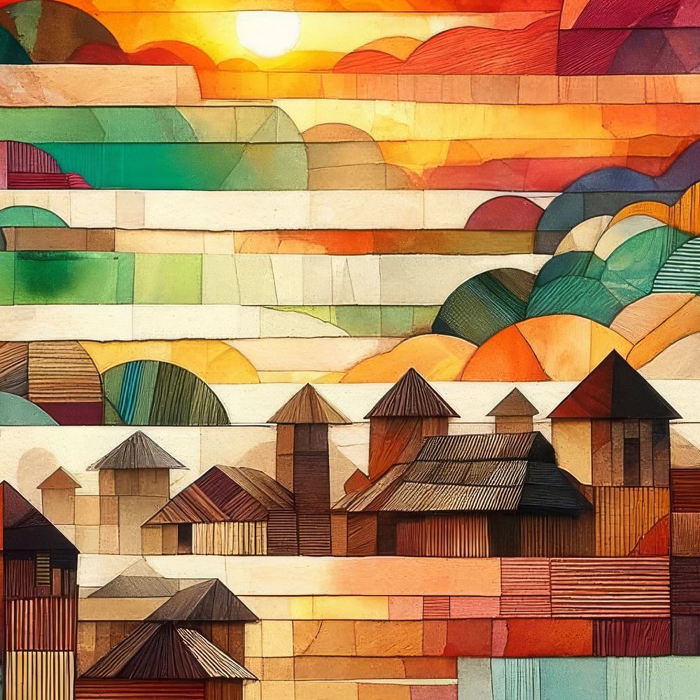 Eine idyllische und farbenfrohe Collage, die eine Landschaft mit sanften Hügeln und einem ländlichen Dorf bei Sonnenuntergang oder Sonnenaufgang zeigt. Die Hügel und der Himmel bestehen aus horizontalen Streifen in einer Reihe von Farben, darunter Rot, Orange, Gelb und verschiedene Grüntöne, die ein warmes und stimmungsvolles Licht erzeugen. Der mittlere Teil der Collage stellt die Sonne dar, deren Strahlen sich über den Himmel ausbreiten und einen strahlenden Effekt erzeugen.