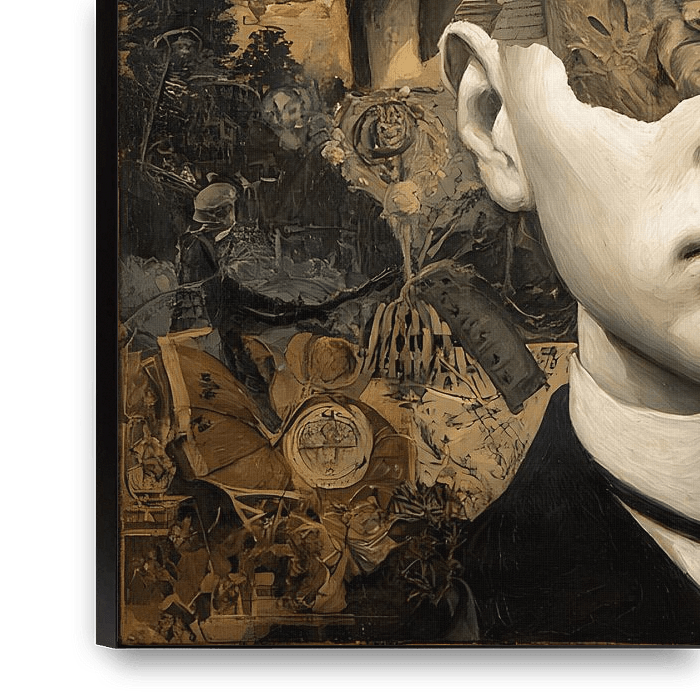 Dieses auffällige Wandkunstwerk zeigt einen nachdenklichen Mann, dessen Gedanken sich zu einer vielschichtigen Collage entfalten, in der Fantasie und Emotionen zu einer kraftvollen visuellen Erzählung verschmelzen. Inspiriert von klassischen Ölmaltechniken und zeitgenössischem Surrealismus offenbart dieses Kunstwerk Fragmente von…