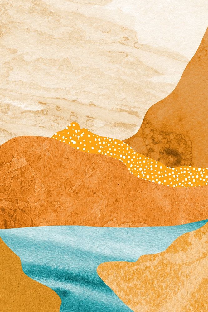 Collage: abstrakte Landschaft in frischen Farben. Boho-Stil. Sorgfältig komponierte Collage, die u. a. mit Aquarellfarben und Tupfen zu einem überraschenden Ganzen zusammengefügt ist.