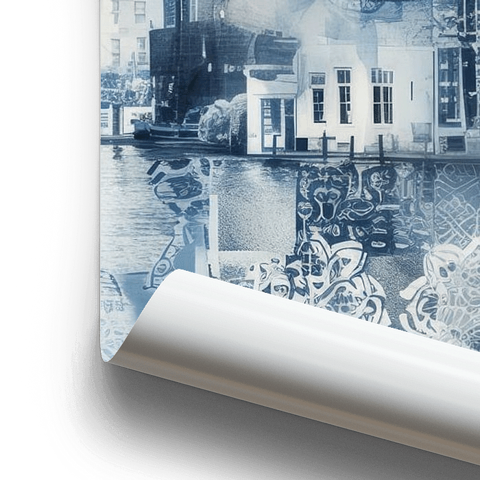 Bestelle dieses Landschafts-Wandbild Collage aus Delft, in Delfter Blau von Studio Allee als Reproduktion auf Leinwand, Alu-Dibond, als Poster, Fototapete oder Acrylglasbild.