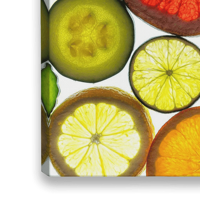 Collage aus Obst- und Gemüsescheiben mit weißem Hintergrund. Grapefruit, Orange, Kiwi, Zitrone, Limette, Mandarine, Zucchini, Gurke.