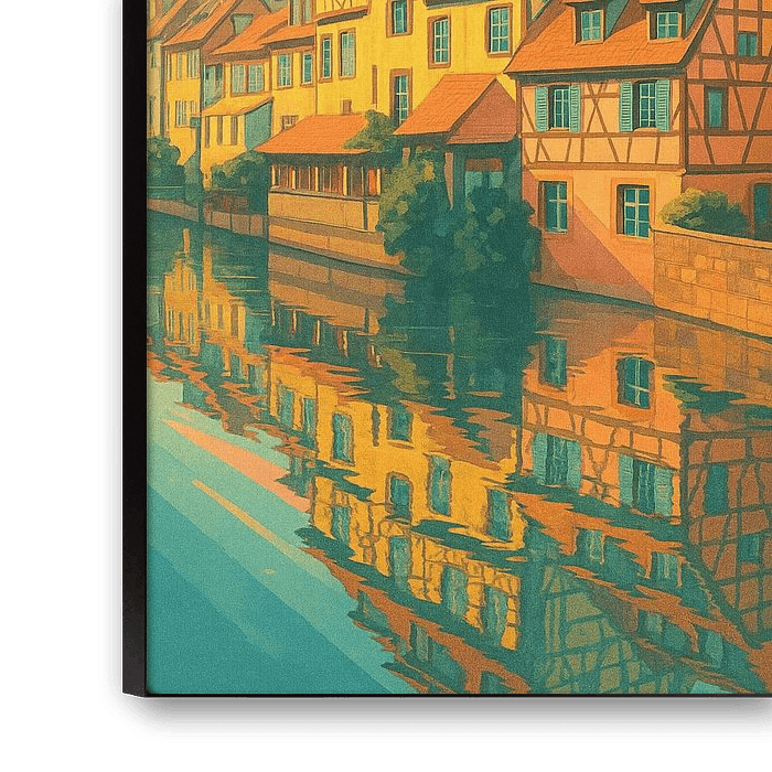 Dieses Art-Déco-Reiseplakat von Colmar fängt den Charme des Elsass mit seinen farbenfrohen Fachwerkhäusern ein, die sich im ruhigen Wasser des Kanals spiegeln. Die warme Farbpalette aus Gelb-, Rot- und Blautönen bringt die märchenhafte Atmosphäre dieser malerischen französischen Stadt zum Ausdruck, während strahlende Lichtstrahlen ein nostalgisches Art-déco-Flair schaffen. Colmar, das oft als das "Klein-Venedig" des Elsass bezeichnet wird, ist für seine mittelalterlichen Straßen, seine Weinkultur und seine zeitlose Schönheit bekannt. Dieses Kunstwerk ist eine Hommage an diesen Charme und damit ideal für Reiseliebhaber und Bewunderer von Vintage-Design. Die kühne Komposition und die stilisierte Geometrie machen dieses Poster vielseitig und passen in moderne, klassische oder eklektische Interieurs. Es eignet sich perfekt als dekorativer Mittelpunkt und bringt den märchenhaften Geist von Colmar in Ihr Zuhause.