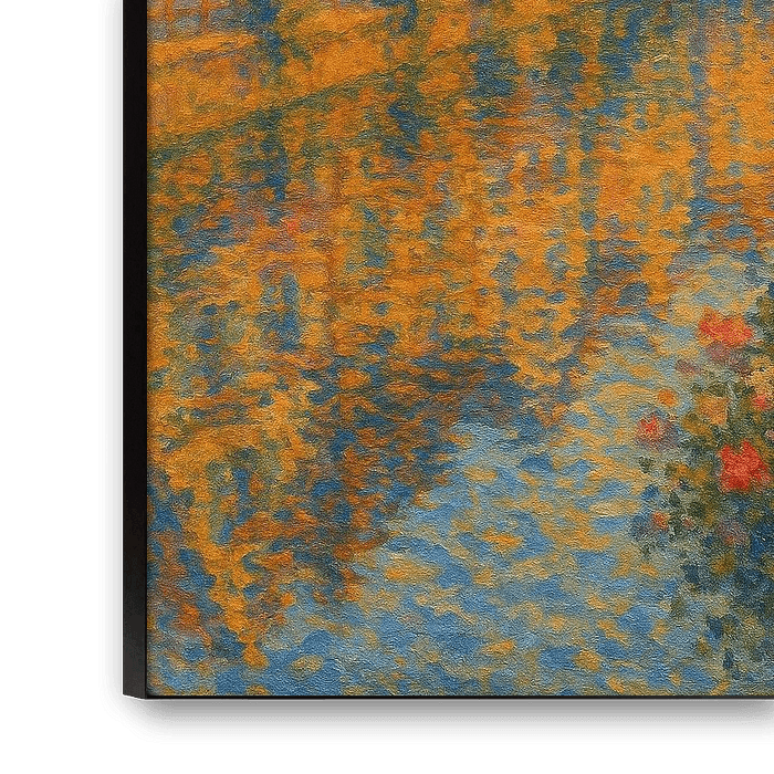 In Colmar, wo sich die Fachwerkhäuser über die ruhigen Kanäle lehnen, ist der Abend wie ein Seufzer. Der Künstler taucht die Stadt in geschmolzenes Gold und übersetzt die Reflexion in ein Gefühl. In Anlehnung an Monets Faszination für das Wasser und das gespiegelte Licht fängt jeder Pinselstrich die Bewegung in der Stille ein - ein flackerndes Fenster, ein zitterndes Blütenblatt in der Strömung.