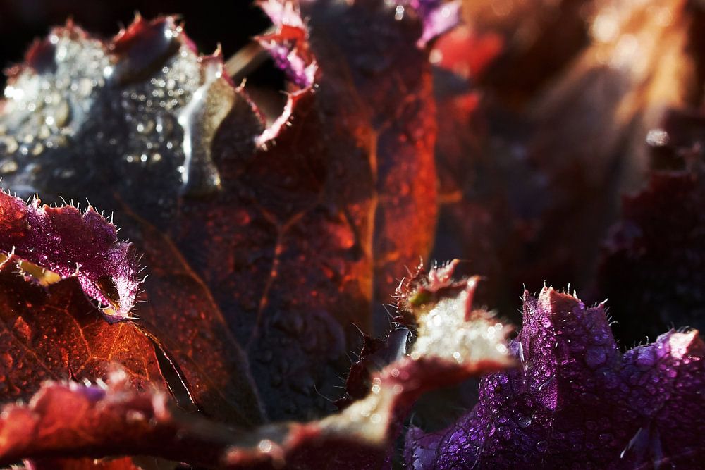 Deze bladeren, nog nat van de dauw, geven prachtige schakeringen van paars en orange in de zon.