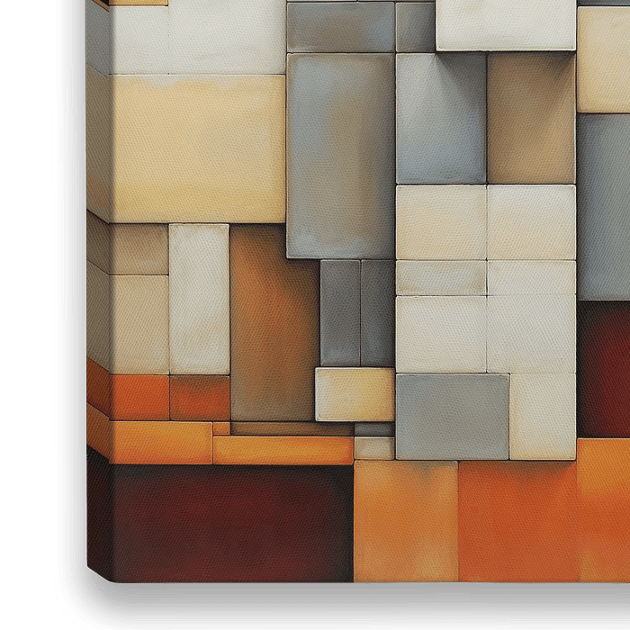 Dieses digitale Kunstwerk besteht aus einer abstrakten Komposition rechteckiger Flächen in warmen und erdigen Tönen, wie Orange, Ockergelb, Braun, Grau und Creme. Die geometrischen Formen sind sorgfältig zusammengesetzt und vermitteln einen strukturierten und doch dynamischen Eindruck. Die Verwendung von Farben und die Platzierung der…