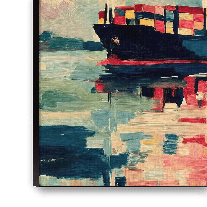 Dieses impressionistische Gemälde zeigt ein großes Containerschiff, das über ruhiges Wasser gleitet. Der dunkelblaue Rumpf und das rot-gelb gehaltene Deck tragen Reihen farbenfroher Container in Rot, Gelb, Blau und Grün. Das Wasser reflektiert die Farben des Schiffes und des Himmels, der sanft von Rosa und Gelb zu Blau übergeht. Sichtbare, weiche Pinselstriche verleihen dem gesamten Bild Bewegung und Atmosphäre. Der Himmel mit seinen pastelligen Wolken schafft einen beruhigenden, zugleich farbenreichen Hintergrund, der das Schiff als zentralen Fokus hervorhebt.
