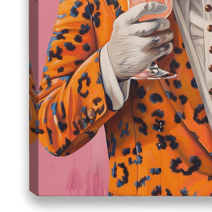 Der Eisbär trägt eine leuchtend orangefarbene Jacke mit einem Leopardenmotiv, das einen lebhaften Kontrast zu seinem weißen Fell bildet. Die Jacke wird durch eine blaue Fliege und…