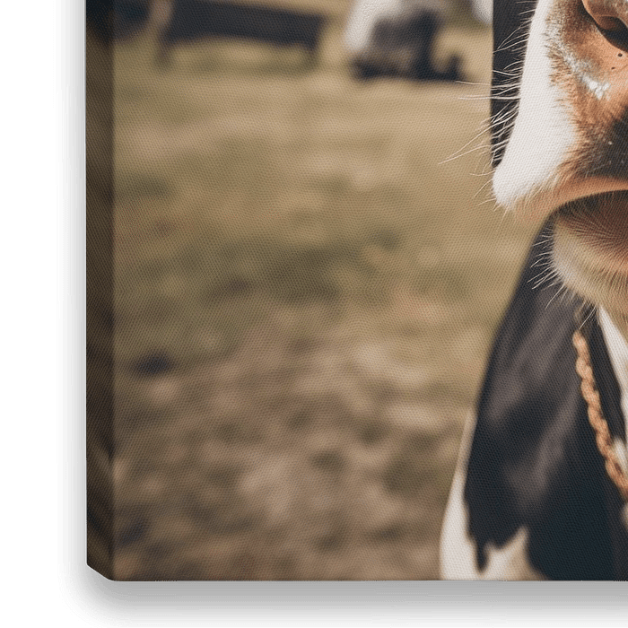 Bestelle dieses Kuh-Wandbild Cooler Cow-Boy mit Hut von YArt als Reproduktion auf Leinwand, Alu-Dibond, als Poster, Fototapete oder Acrylglasbild.