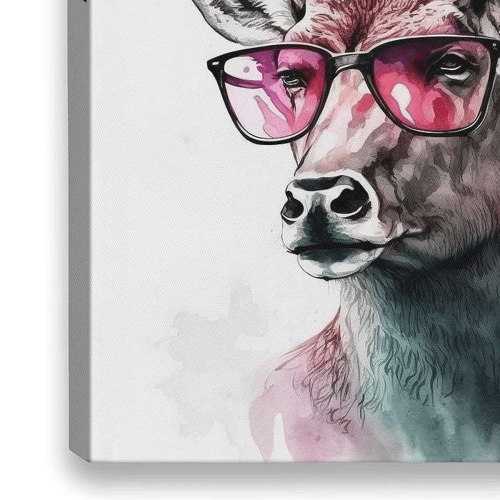 Ein majestätischer Hirsch mit beeindruckendem Geweih trägt eine auffällige rosa Sonnenbrille und strahlt eine lässige Attitüde aus. Das schwarz-weiße Bild verleiht ihm eine zeitlose Eleganz.