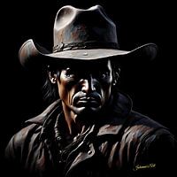 Ein schroffer Cowboy steht in der Stille, seine Präsenz ist ebenso von der Stille geprägt wie von der rauen Landschaft, die ihn zu umgeben scheint. Sein düsterer Gesichtsausdruck wird teilweise vom Schatten seines breitkrempigen Hutes verdeckt, doch der nach unten gerichtete Blick deutet auf eine tiefe Nachdenklichkeit hin, vielleicht…