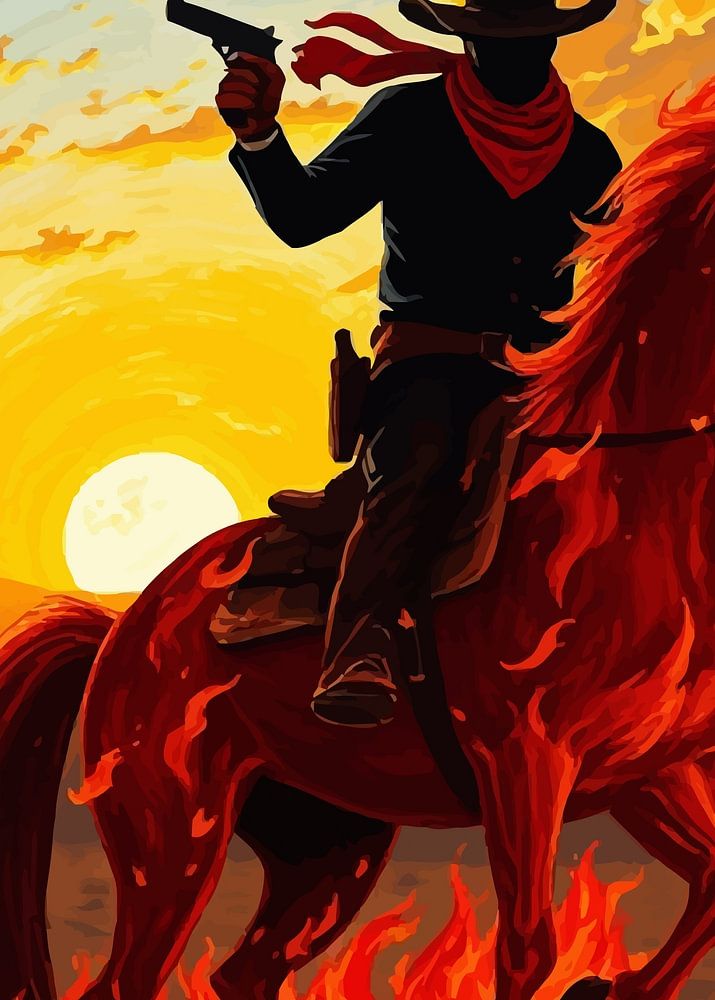 Ein in dunklen Tönen gehaltener Cowboy reitet auf einem Pferd, das in Flammen aufgeht. Er trägt einen Cowboyhut, ein dunkles Hemd, Jeans und ein rotes Halstuch. In der Hand hält er eine Pistole.