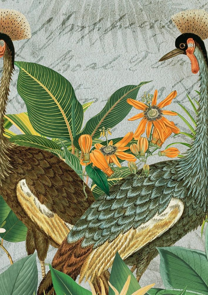 Majestätische Kraniche in der tropischen Vegetation im Vintage-Hintergrund mit Text-Elementen