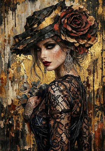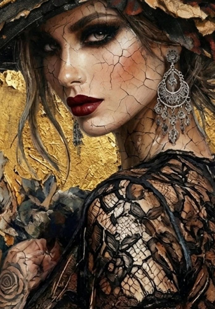 Eine hypnotische, provokante und zutiefst atmosphärische Auseinandersetzung mit stiller Rebellion. „ "Crimson Defiance" “ fängt einen Moment intensiver Kraft ein, umhüllt von Schichten aus Blattgold und filigraner dunkler Spitze. Dieses Kunstwerk wurde geschaffen, um ein minimalistisches Loft oder ein hochwertiges Kreativbüro…