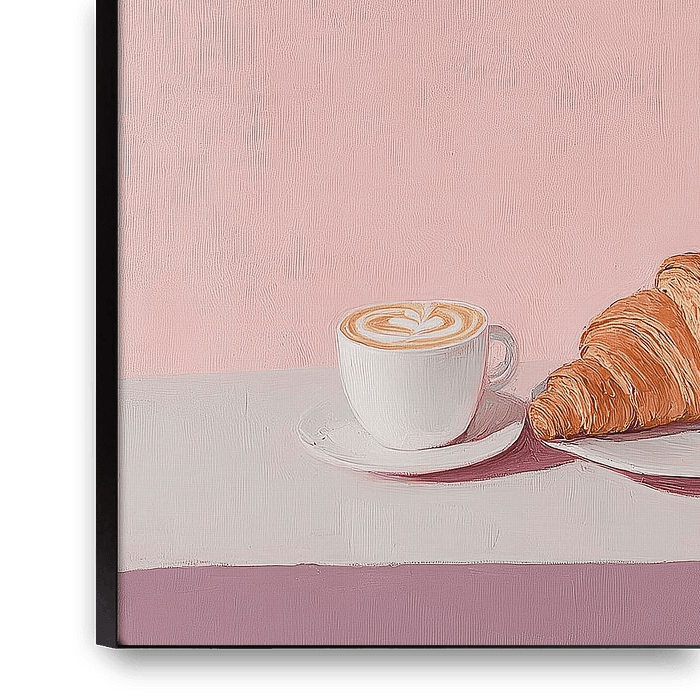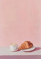 Bestelle dieses Stilleben Croissant Kaffee Frühstück Rosa Preppy von Niklas Maximilian als Reproduktion auf Leinwand, Alu-Dibond, als Poster, Fototapete oder Acrylglasbild.