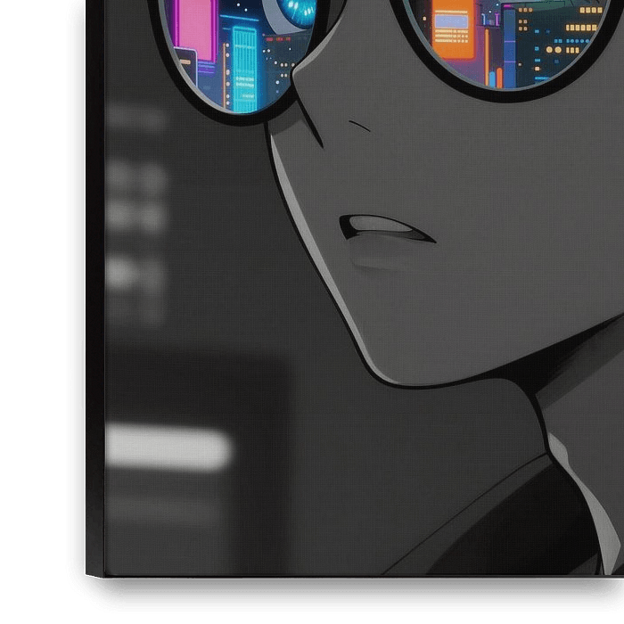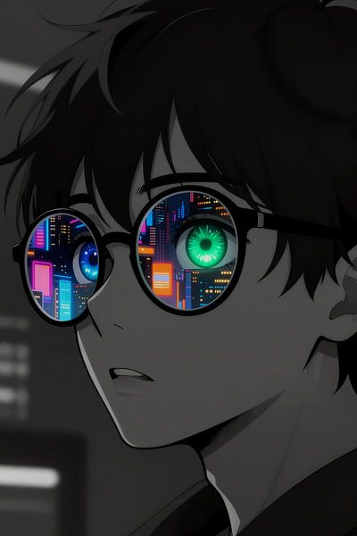 Ein monochromes Porträt eines Jungen, in dessen Brille sich eine lebendige, neonbeleuchtete Stadtlandschaft spiegelt. Der Kontrast zwischen seiner dunklen Silhouette und den farbenfrohen, leuchtenden digitalen Augen fängt das überwältigende Wunder eines hochtechnisierten Großstadtlebens ein.