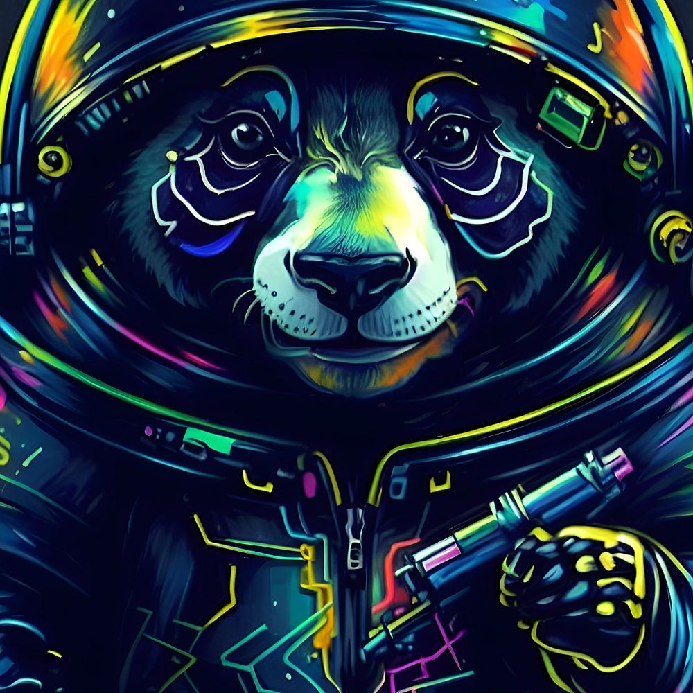 Ein Cyberpunk-Panda der digitalen Kunst, der einen Raumanzug trägt.