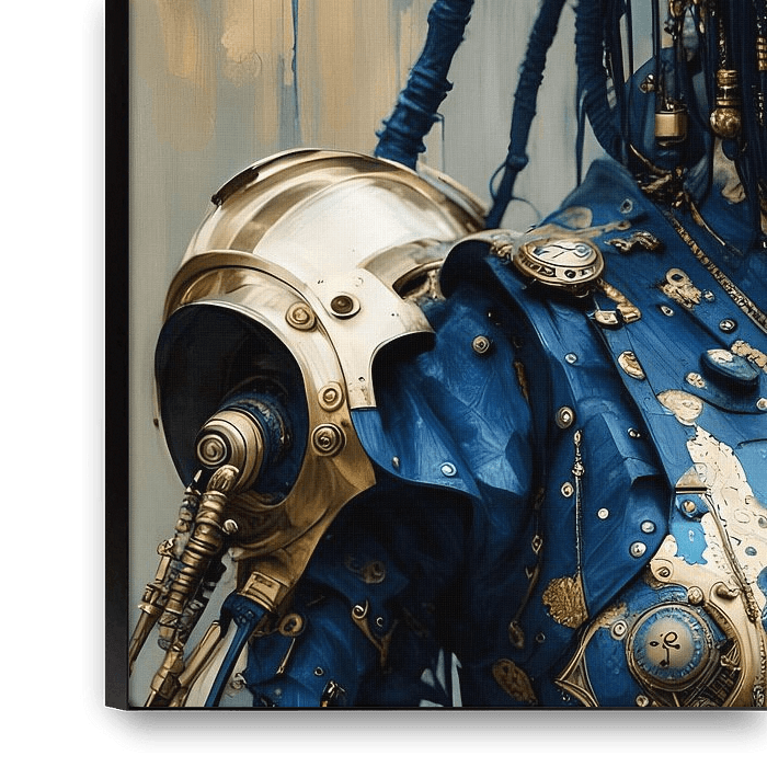 Bestelle dieses Porträt Cyborg-Porträt in Dunkelblau und Gold von Anouk Maria als Reproduktion auf Leinwand, Alu-Dibond, als Poster, Fototapete oder Acrylglasbild.