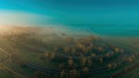 Die Radrennbahn des U.W. & T.C. de Volharding am Nedereindse-See in Nieuwegein bei einem nebligen Sonnenaufgang.