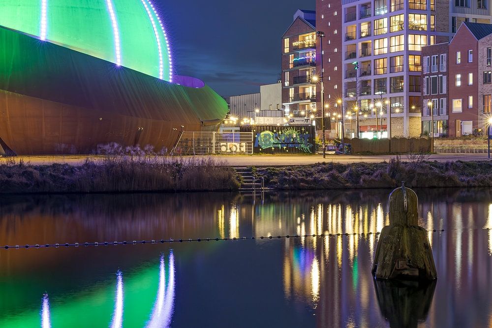 Die große, runde Kuppel des DOT (ehemals Infoversum) verwandelt sich in der Weihnachtszeit in eine riesige, beleuchtete Weihnachtskugel.