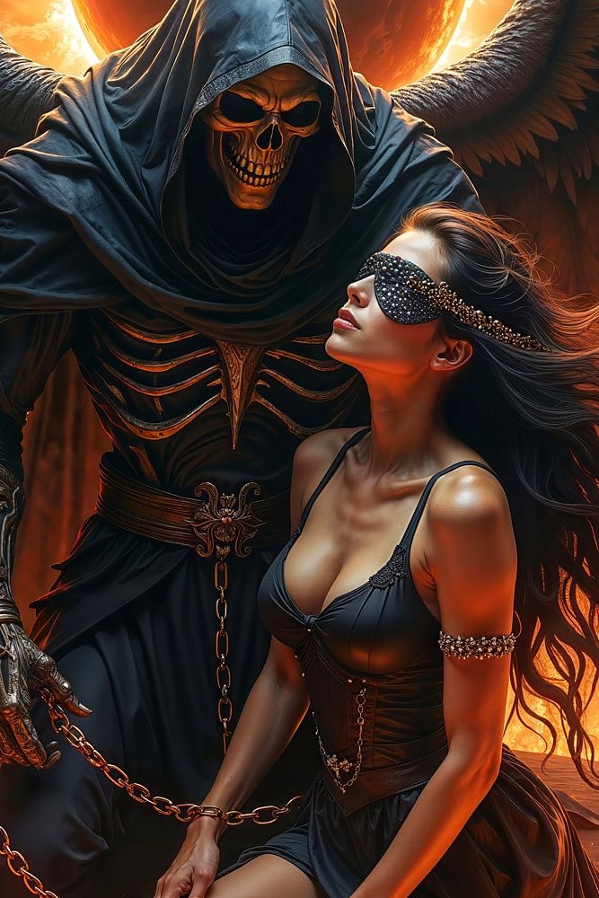 Dieses Werk ist mehr als ein Bild der Verdammnis – es ist ein Symbol für Macht, Unterdrückung und verführerische Hingabe. Der Sensenmann verkörpert absolute Dominanz und Tod, während die gefesselte Frau Sinnbild für Schönheit, Opferbereitschaft und die gefährliche Faszination des Verbotenen ist.