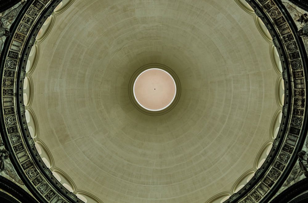 Die wunderschön restaurierte Decke der Kuppel dieser Brüsseler Kirche. Schöne Symmetrie und, wie nicht anders zu erwarten, schöne Glasfensterdekorationen