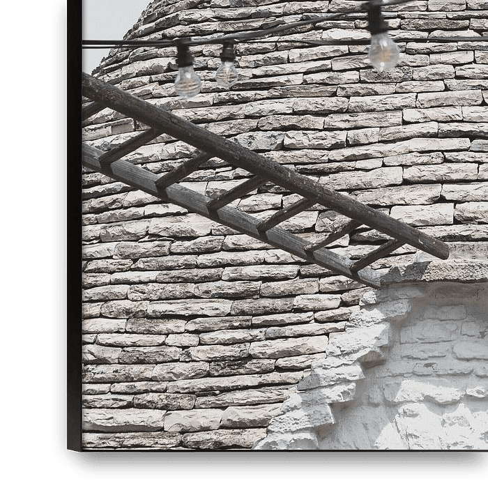 Dieses Foto zeigt das charakteristische Kegeldach eines Trullo, eines traditionellen Bauwerks der Region Apulien. Das Dach erhebt sich majestätisch über die engen Gassen von Alberobello, wie ein verstecktes Juwel inmitten der alten Häuser.