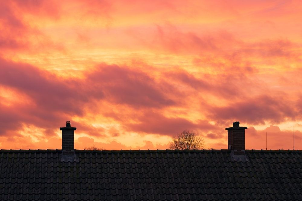 Dächer einer Neubausiedlung aus den 1950er Jahren bei Sonnenuntergang.