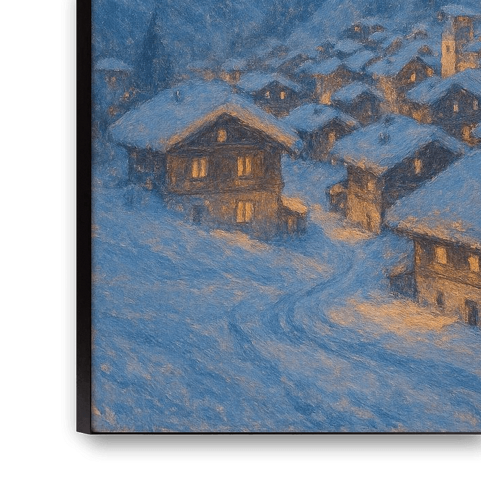 Die Szene vermittelt Intimität in der Weite. Jede Hütte strahlt Wärme aus, ihr gelbes Licht bildet einen sanften Rhythmus durch das verschneite Dorf. Oben steht der hoch aufragende Gipfel zeitlos und still, ein Wächter des Tals. Das Gleichgewicht zwischen Schatten und Licht erzeugt ein Gefühl stiller Ehrfurcht - eine Erinnerung daran, wie klein das menschliche Licht im Vergleich zur Unermesslichkeit der Natur immer noch mächtig sein kann.