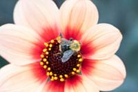 Eine Makroaufnahme einer zartrosa Dahlie mit einer Biene.