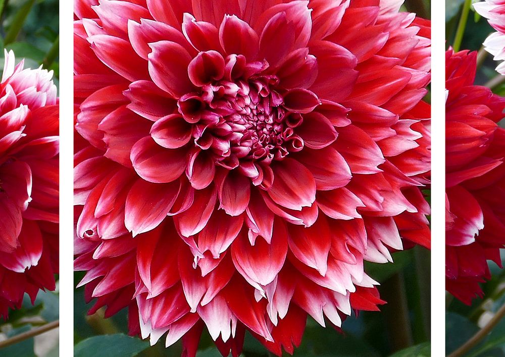 Dahliensorte "Aachener Karneval" als Triplet mit Bildunterschrift