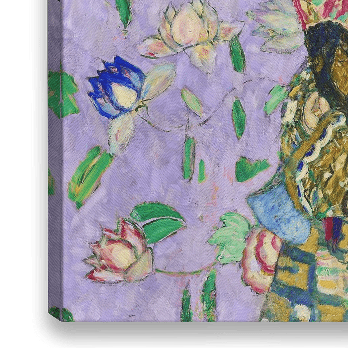 Bestelle Dame mit Fächer, Gustav Klimt (violett, digital vergrößert) als Reproduktion auf Leinwand, Alu-Dibond, als Poster, Fototapete oder Acrylglasbild.