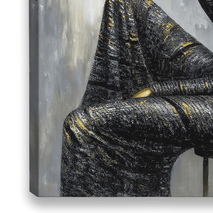 Elegantes Porträt mit schimmerndem Goldhut und ruhiger Silhouette. Zeitgenössische Malerei, die jeden Raum in ein stilvolles Statement verwandelt.