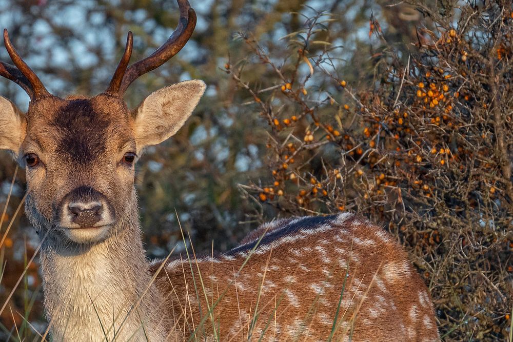 Ein Damhirsch in der Morgensonne in den Amsterdamer Wasserversorgungsdünen.