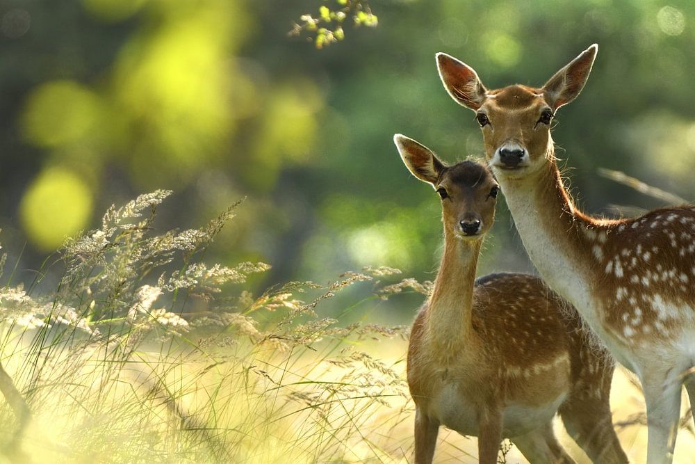 Damhirsch (Dama dama) mit Kalb im Wald, Amsterdamse Waterleidingduinen, Nordholland, Niederlande. Marianne Brouwer / Natur auf Vorrat