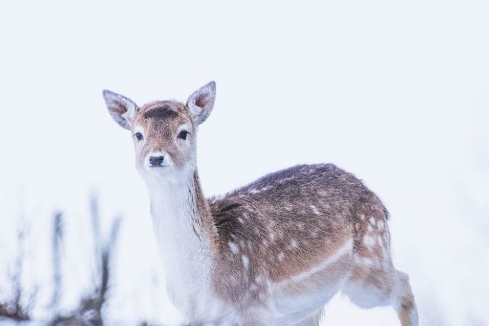 Damhirsch in den Amsterdamer Wasserversorgungsdünen. Im Schnee, Winter 2021. Schönes weißes Dünengebiet.