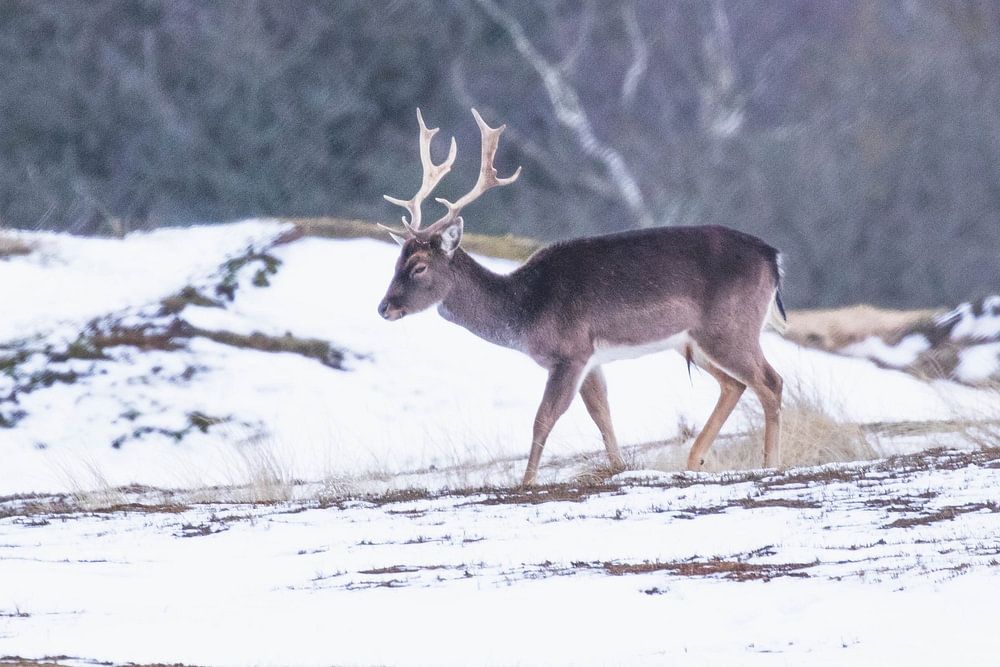 Damhirsch in den Amsterdamer Wasserversorgungsdünen. Im Schnee, Winter 2021. Schönes weißes Dünengebiet.