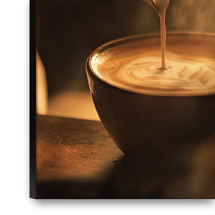 Eine dampfende Tasse Kaffee, umgeben von sanften Lichtspielen, lädt zum Verweilen ein. Die geschickte Hand, die die seidige Milch einschenkt, verkörpert das perfekte Zusammenspiel von Kunst und Genuss. Dieses Bild verleiht der Küche oder dem Wohnzimmer eine gemütliche Atmosphäre, perfekt für entspannte Morgenstunden oder gesellige…