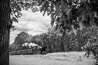 Dampfzug mit Rauch aus der Lokomotive fahren in der Landschaft mit Rauch aus dem Schornstein. Die schwarz-rote Lokomotive zieht einen Eisenbahnwaggon mit Touristen. Schwarz-Weiß-Foto mit einem nostalgischen Vintage-Look.