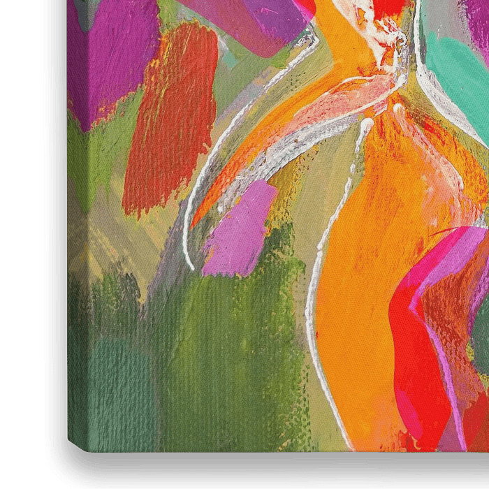 Zwei Figuren in einem farbigen Raum. Fließende weiße Linien verstärken die Bewegung der tanzenden Menschen. Es ist ein abstrahiertes Gemälde kombiniert mit grafisch gefärbten, transparenten Oberflächen.