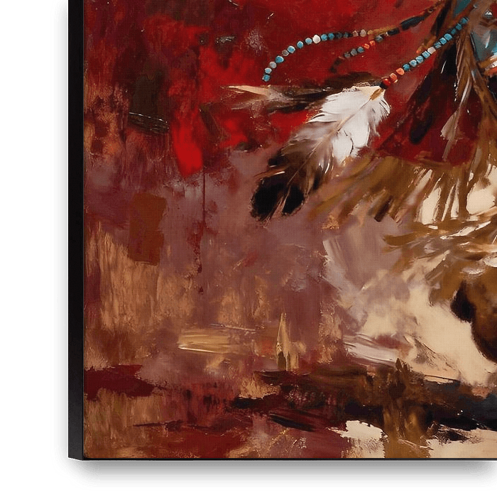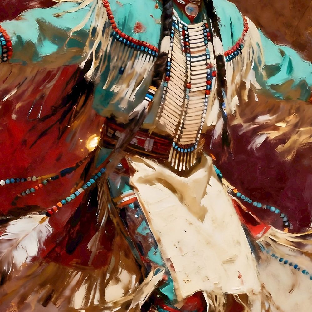 Eine indianische Tänzerin ist auf dem Höhepunkt der Bewegung eingefangen, eingefroren in einem kraftvollen und doch anmutigen Moment, der das Erbe und den Geist feiert. Die traditionellen Gewänder der Tänzerin sind lebendig, jede Feder und jede Perle ist akribisch dargestellt, um die kulturelle Bedeutung und die über Generationen…