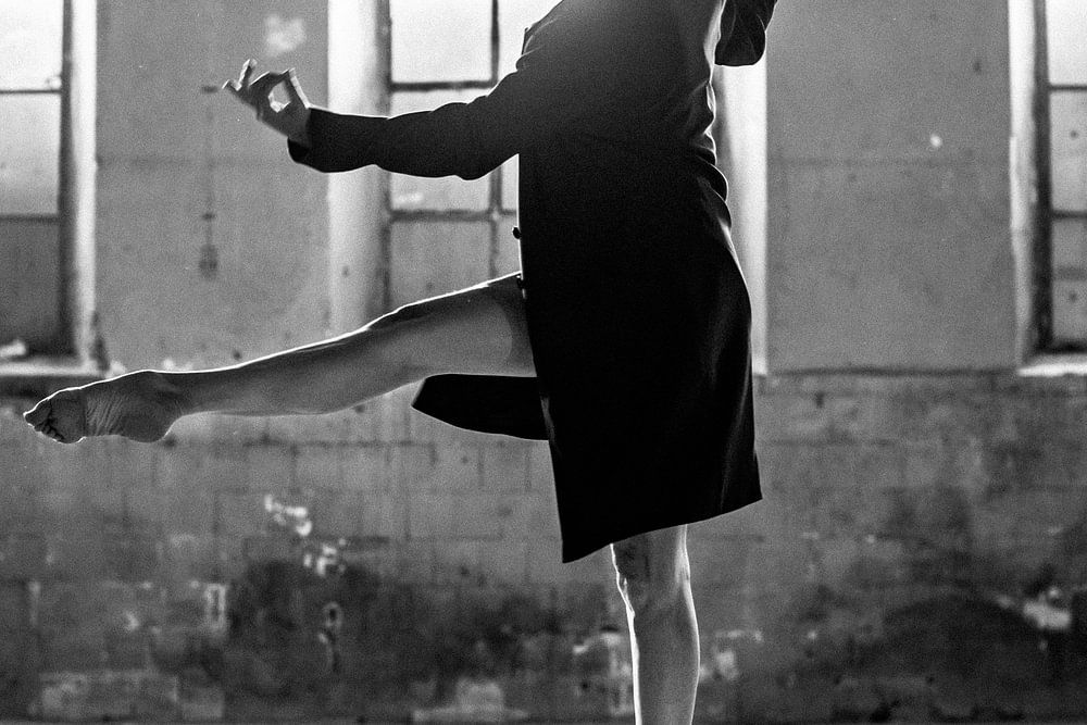 Danspose in de industriële omgeving van de verlaten chocolade fabriek in Alkmaar. Het contrast tussen de sierlijkheid van de dans tov de ruwheid van het gebouw.