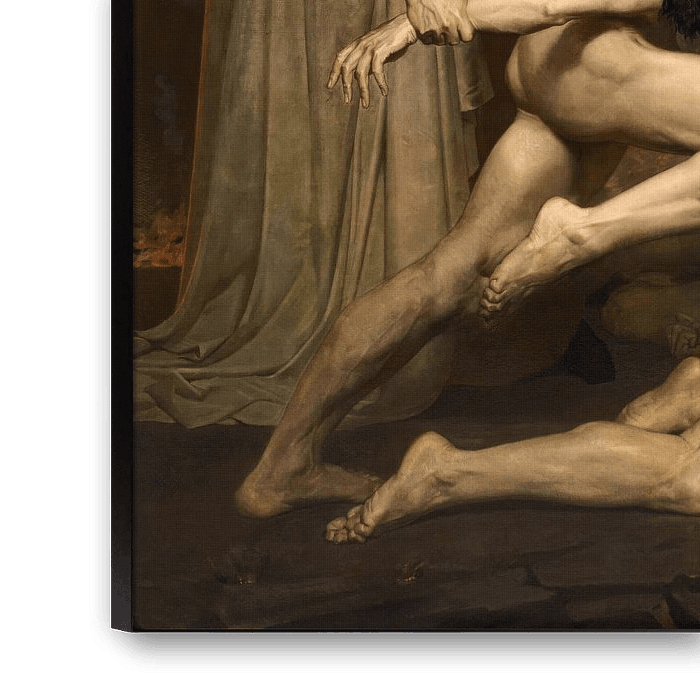 Auf der rechten Seite steht der Dichter Dante, gekleidet in seine traditionelle rote Kapuze und sein Gewand, neben seinem Führer Virgil, der einen Lorbeerkranz trägt. Sie beobachten die Gewalt mit einem Ausdruck des Entsetzens und des Urteils, wobei sie ihre Gesichter vor dem Gestank und der Brutalität schützen. Der Hintergrund ist ein dunkler, düsterer Abgrund, über dem ein geflügelter Dämon mit einem grimmigen Lächeln schwebt und die ewige Bestrafung überwacht. Die Beleuchtung ist dramatisch und theatralisch und hebt die blasse Haut der Kämpfer gegen die schattige Umgebung hervor. Dieses Gemälde ist bekannt dafür, dass es sich von Bouguereaus typisch sanften, religiösen Motiven abhebt und stattdessen rohe Kraft, Gewalt und die schreckliche Natur der Verdammnis zeigt.